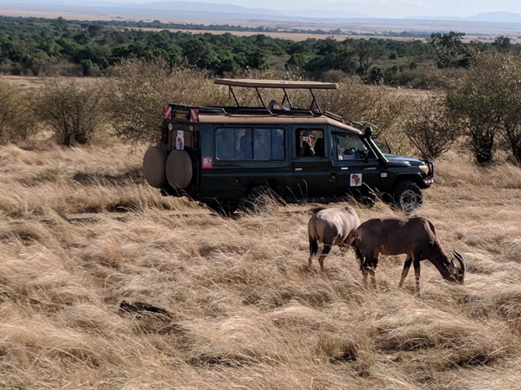 Masai Mara, Kenya, May 19, 2017: Tourists in an all-terrain vehicle exploring the African savannah on safari game drive