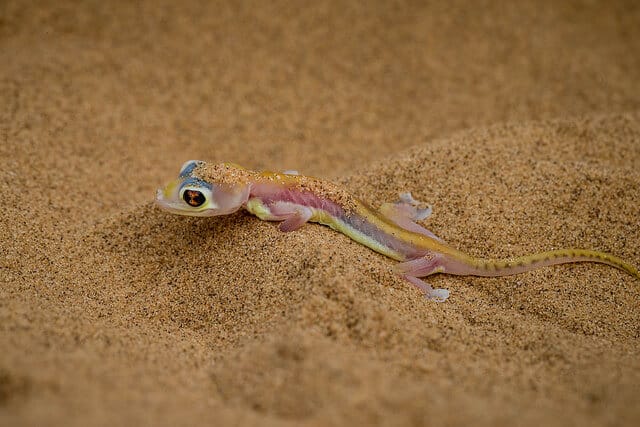 The Namib Desert is home to one of the world’s most fascinating reptiles: the dune-burrowing lizard, also known as the Namib Sand Gecko. This incredible animal has adapted to survive in the hostile desert by digging deep below the sand to escape heat. It can also be buried under the ground for a very long time, coming out at night when the temperatures go down and probing after little insects.